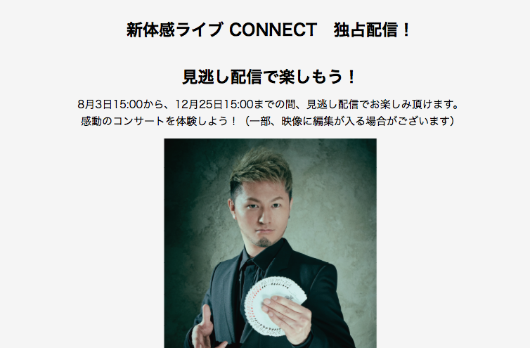 今回のエールマジックオーケストラの様子はdocomoのアプリ「新体感ライブ CONNECT」というアプリで見逃し配信(有料)されています。